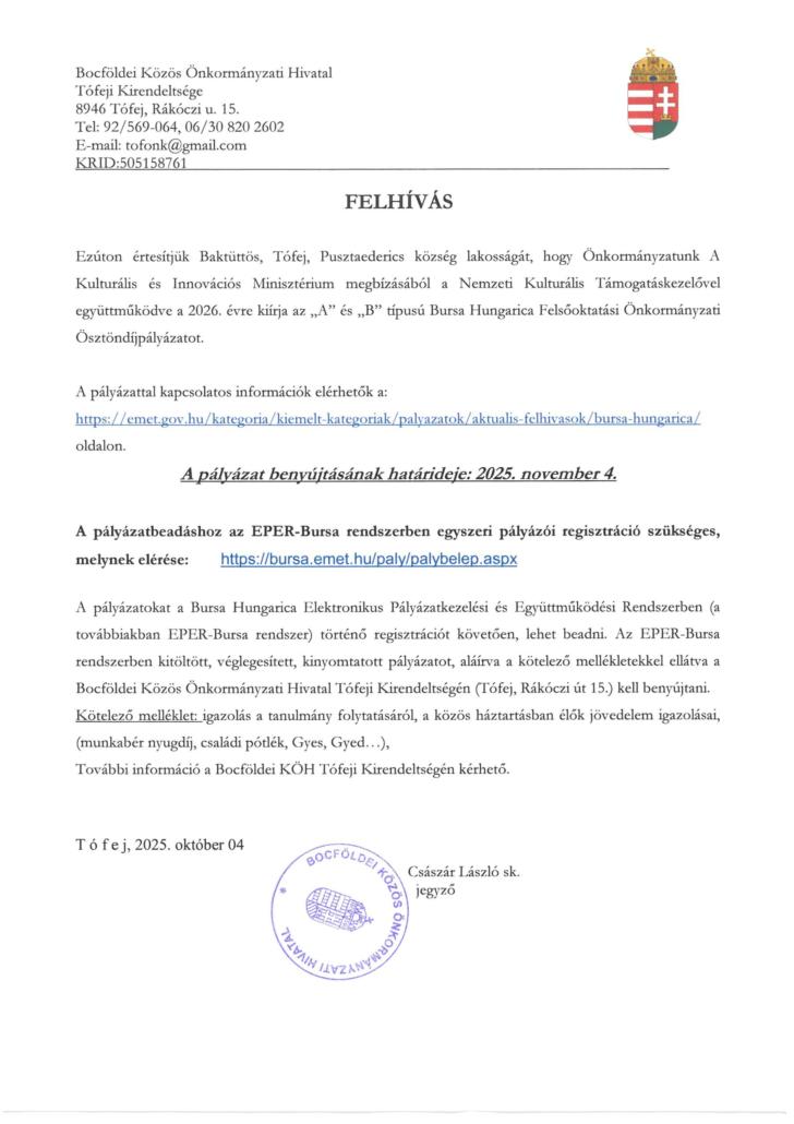 http://www.tofej.hu/wp-content/uploads/2021/11/tofej_cimer.png 0 0 Tófej Község http://www.tofej.hu/wp-content/uploads/2021/11/tofej_cimer.png Tófej Község2025-10-09 12:30:262025-10-09 12:30:26Bursa, felhívás